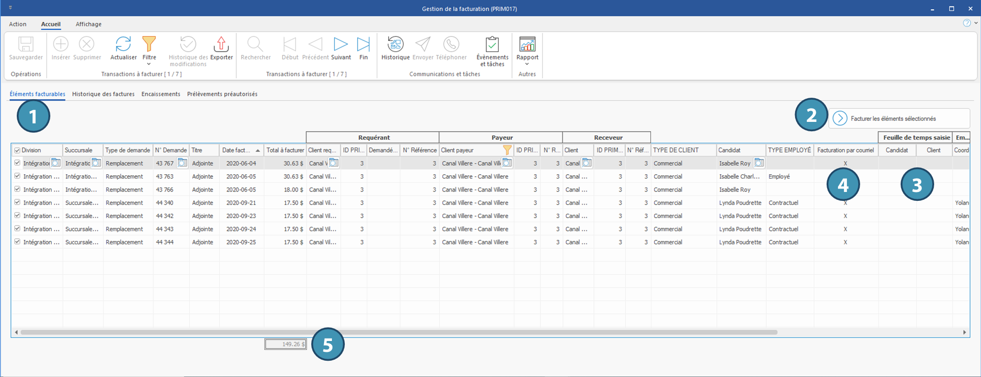 Sous l’onglet Éléments facturables (1), vous trouverez la liste de toutes les demandes prêtes à être facturées. Pour diminuer le nombre d'enregistrements et afficher seulement les éléments désirés, vous pouvez appliquer un ou plusieurs filtres sur chacune des colonnes de cette liste, par exemple, pour ne voir que les factures associées à un client payeur en parficulier.