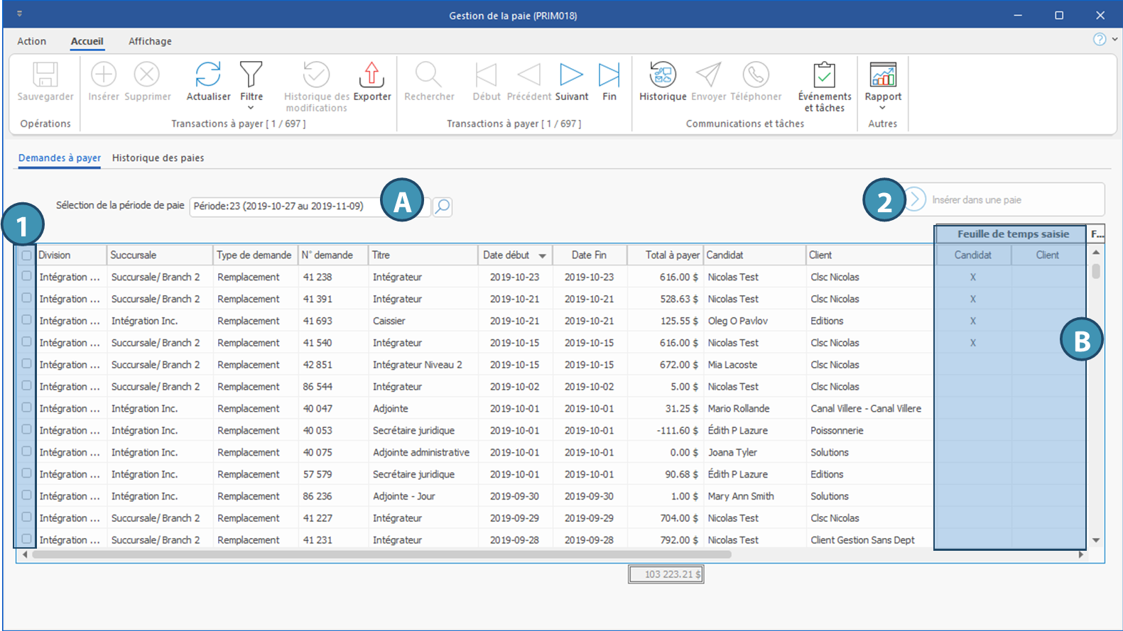 Les demandes qui apparaissent sous cet onglet n’ont pas été payées et sont prêtes à être traitées. Elles s'affichent selon la période de paie sélectionnée (A).