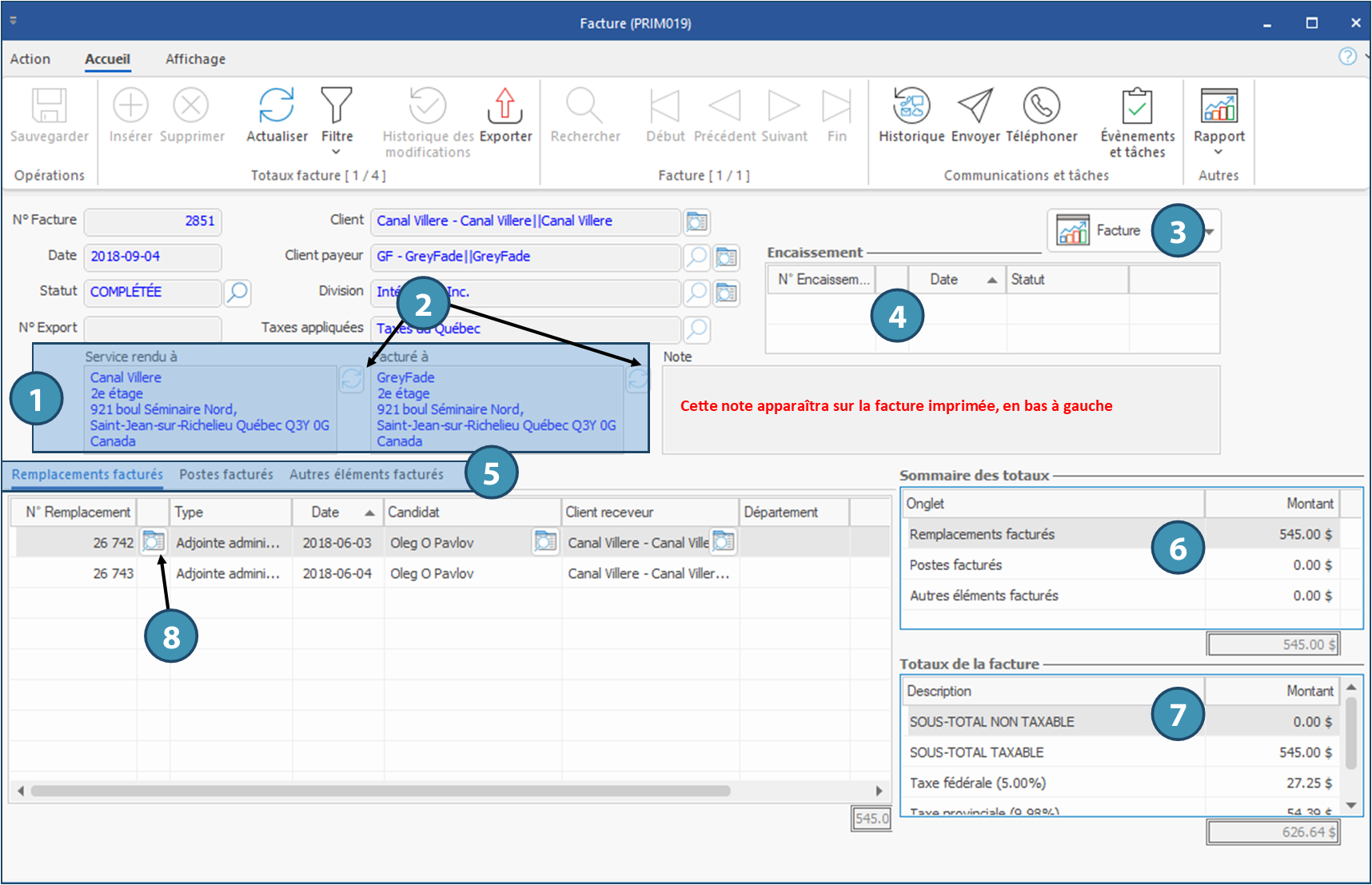 Bouton Facture (3) : Pour imprimer, visualiser ou envoyer la facture par courriel à un client, le statut de la facture doit être « Complétée » ou « Envoyée »