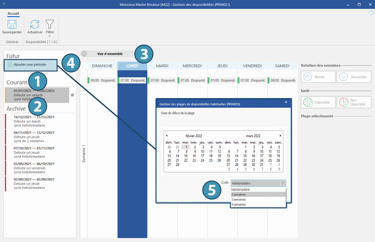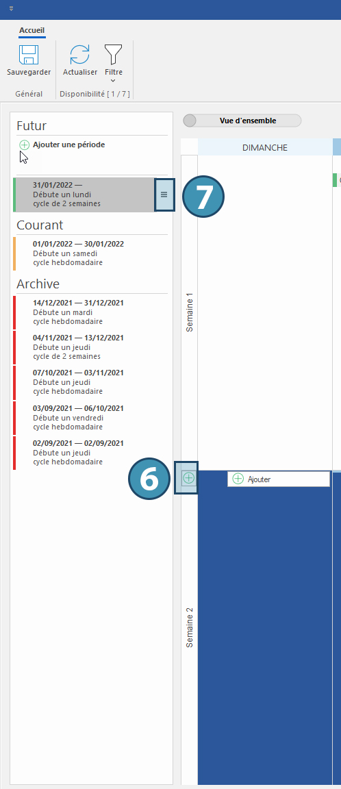 Pour créer un modèle à venir, cliquer sur « Ajouter une période » (4) et sélectionnez la date à laquelle le modèle actuel prendra effet ainsi que le cycle de cet horaire (sur 1 à 4 semaines) (5)