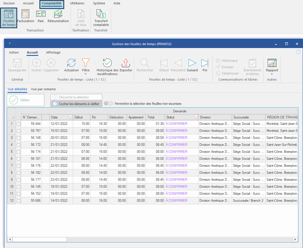 Il est possible de vérifier plusieurs feuilles de temps en un clic : il s’agit d’une vérification en lot.