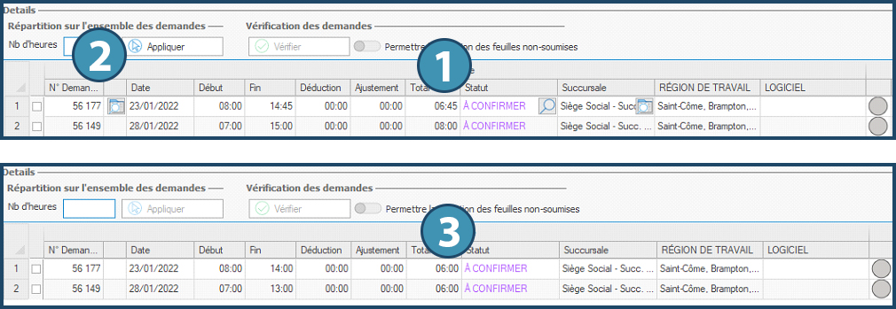 Il est alors possible de vérifier les feuilles de temps de la semaine selon le même processus que dans l’onglet « Vue détaillée » (voir ci-dessus) ou de répartir un nombre d’heures global sur l’ensemble des demandes associant un candidat et un client (2). Consultez la section ci-dessous pour plus de détails sur cette dernière fonctionnalité.