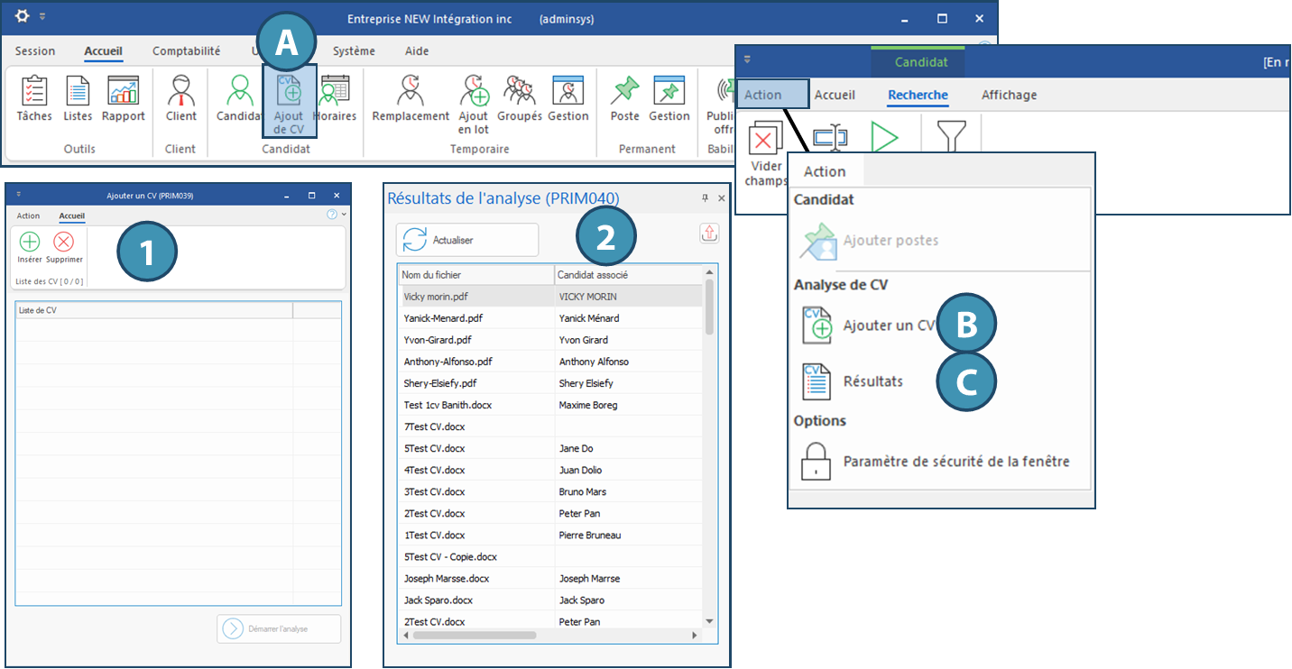À partir du menu Action de la fenêtre Candidat, cliquez sur pour lancer la recherche et ouvrir le volet.