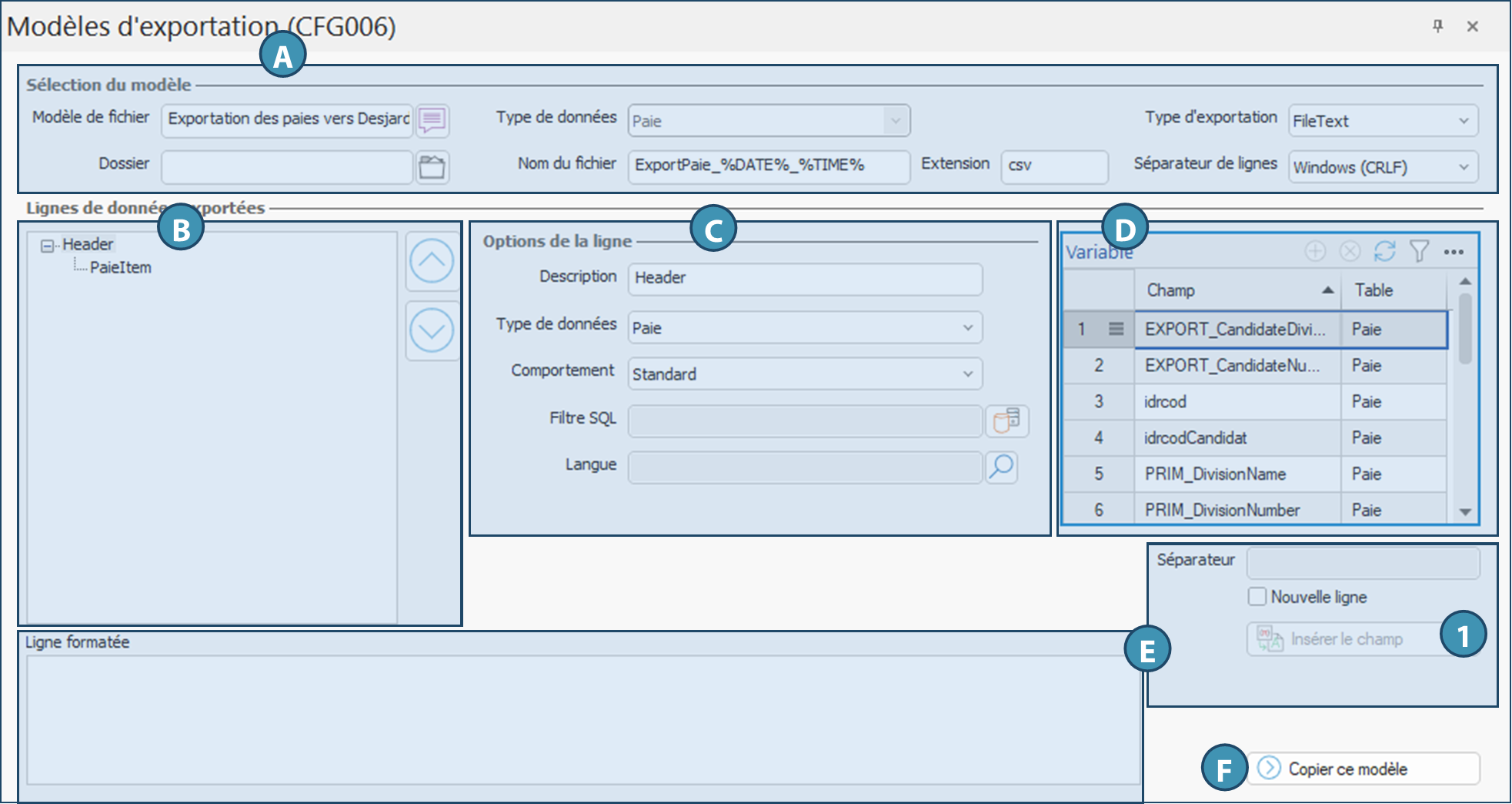 Le volet Modèle d'exportation (CFG006) permet de configurer différents modèles utilisés pour la génération de fichiers d'exportation de données (ex. : paie, temps, candidats) vers des systèmes externes comme un système de paie ou de comptabilité. Ces modèles sont donc personnalisables selon les besoins de l'organisation.