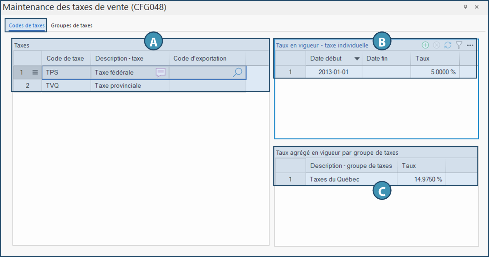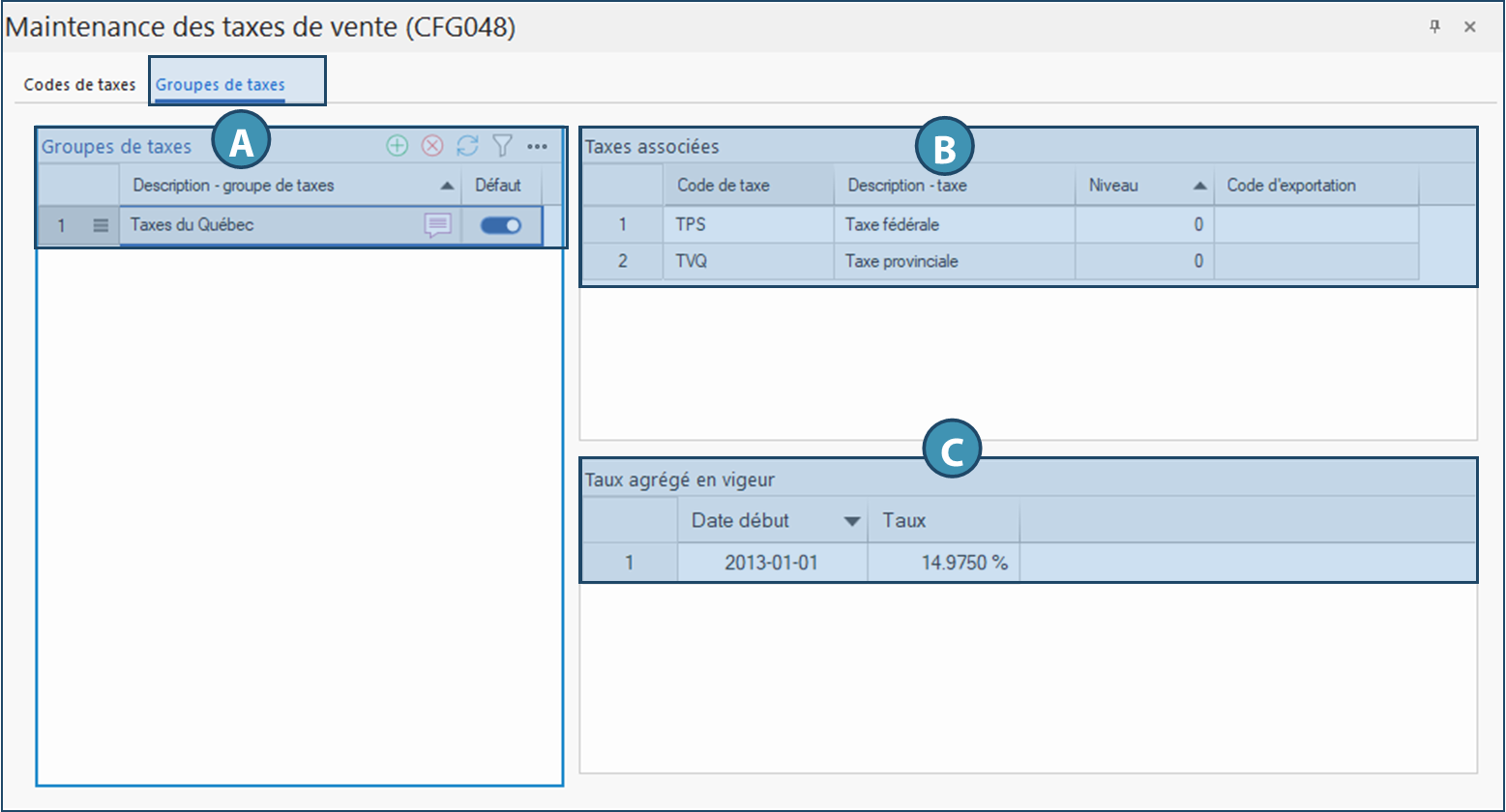 Ce tableau affiche les taxes individuelles qui composent le groupe sélectionné dans la liste de gauche (A).