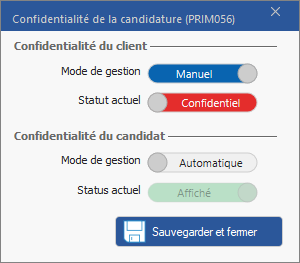 Paramétrer la confidentialité de la candidature vis-à-vis du candidat et du client. Choisissez un mode de gestion – automatique ou manuel – puis indiquez si vous souhaitez que la candidature soit visible par l’entité concernée.