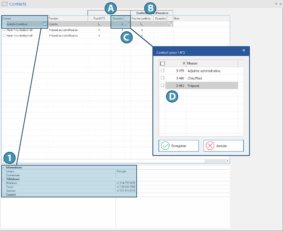 De plus, en utilisant le bouton correspondant, il est possible de paramétrer des exceptions pour certaines des missions du groupé. En cliquant sur le bouton d’édition (C), une fenêtre de sélection s’ouvre dans laquelle l’utilisateur peut cocher les missions pour lequel le contact ne sera pas ajouté automatiquement aux communications (D).