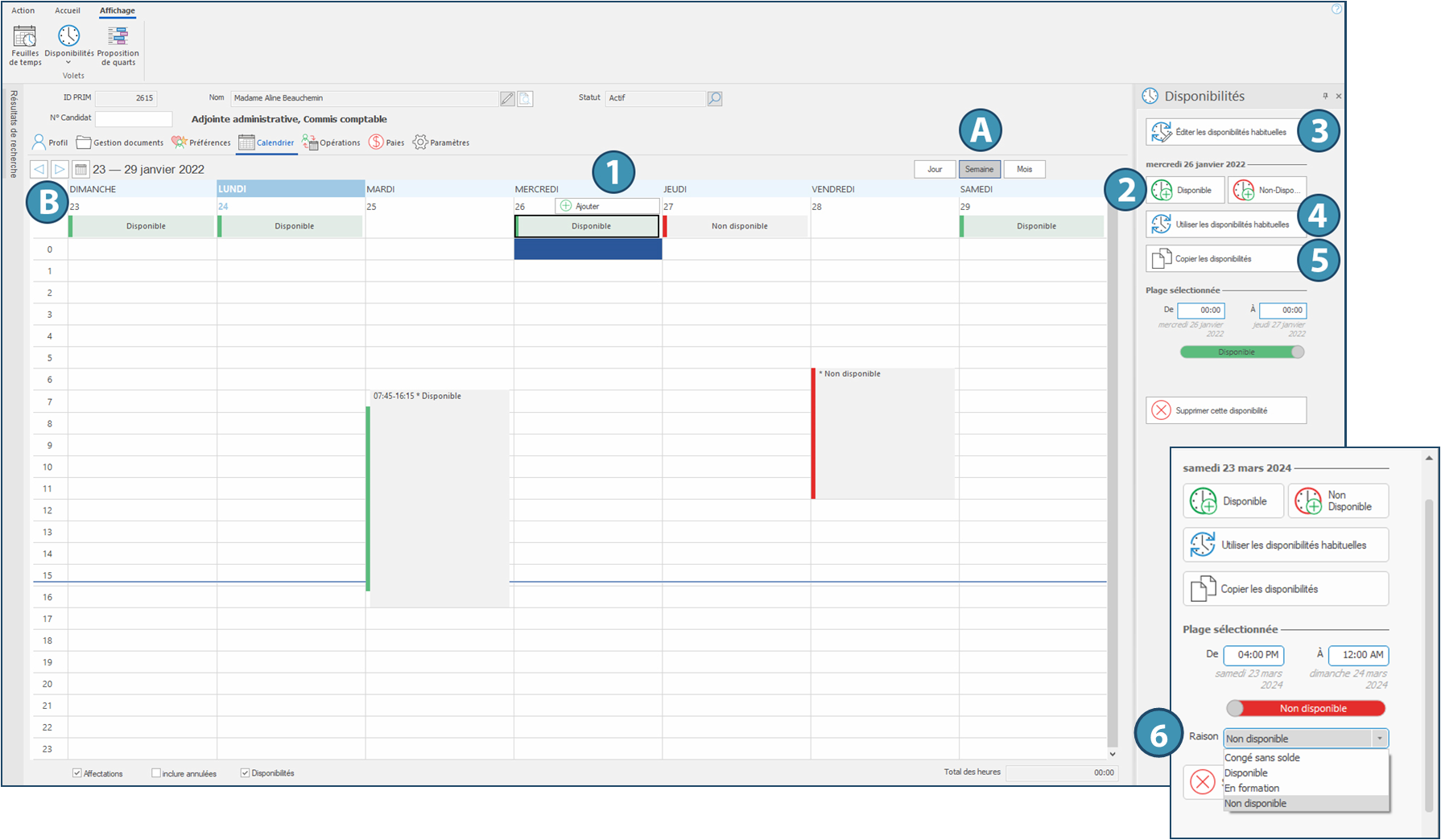 •Vous pouvez également entrer ces disponibilités dans le volet des disponibilités en cliquant sur le bouton correspondant (2).