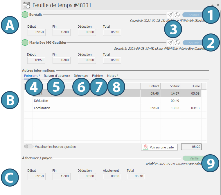Cette section affiche les heures qui seront prises en compte dans l’établissement de la facture et de la paie. Lorsque la feuille de temps a été vérifiée, le nom de l’utilisateur et la date de la validation sont affichés (9).