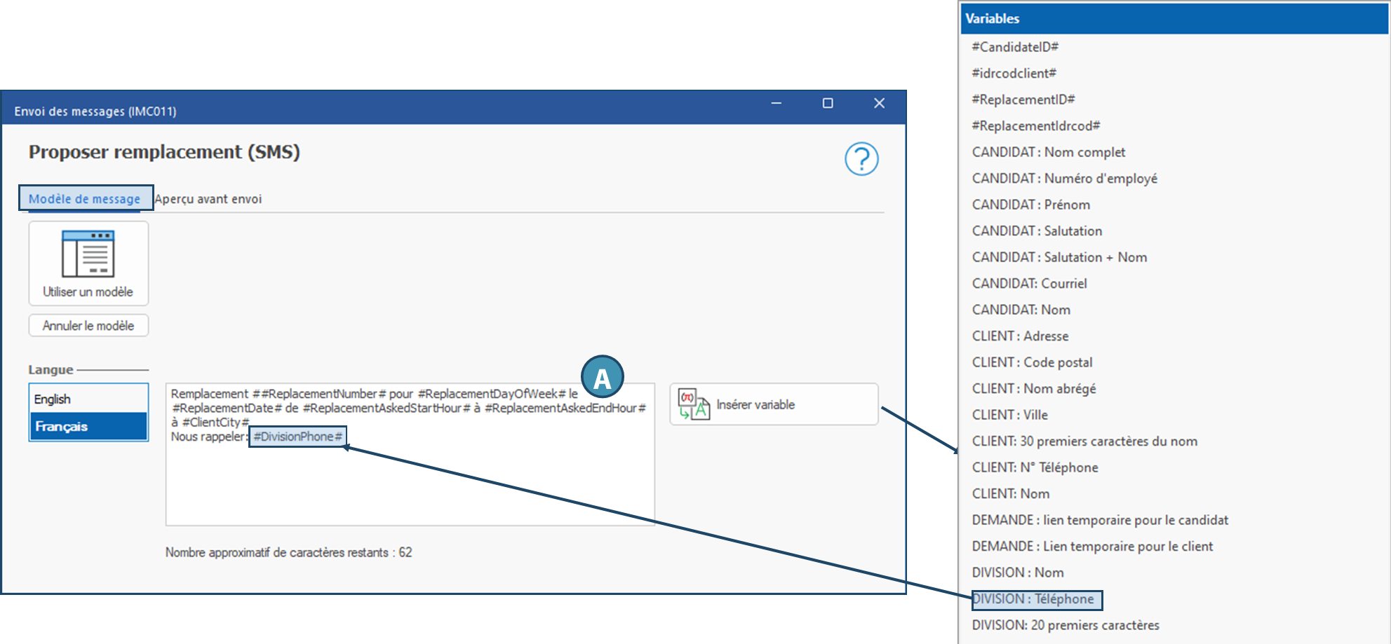 Nombre de caractères restants : indique le nombre de caractères que vous pouvez ajouter dans le SMS sans dépasser la limite.