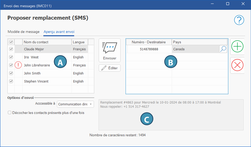 Zone de message (C) : Donne un aperçu du message pour le contact sélectionné. Pour le modifier uniquement pour ce contact, cliquez sur le bouton Éditer. Le champ ne sera alors plus grisé et vous pourrez le modifier pour ce contact uniquement.