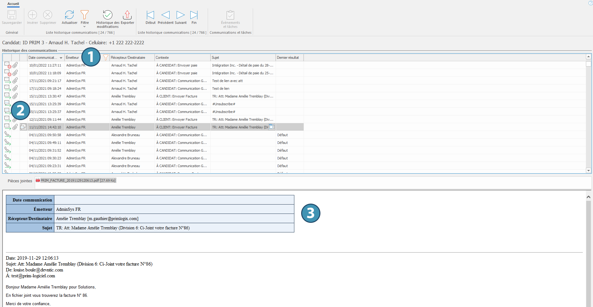 PRIM conserve une trace de l’ensemble des communications échangées avec un contact (candidat, client, employé…), quelle que soit sa forme (courriel, sms, appel téléphonique ou encore interaction via la portail Web).