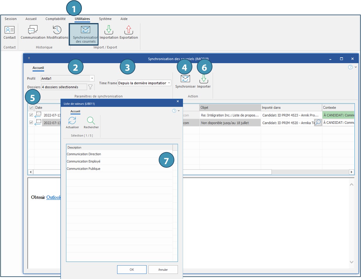 1. Pour synchroniser vos courriels, rendez-vous dans le ruban « Utilitaires » et dans la section « Import / Export », puis cliquez sur le bouton « Synchronisation des courriels »