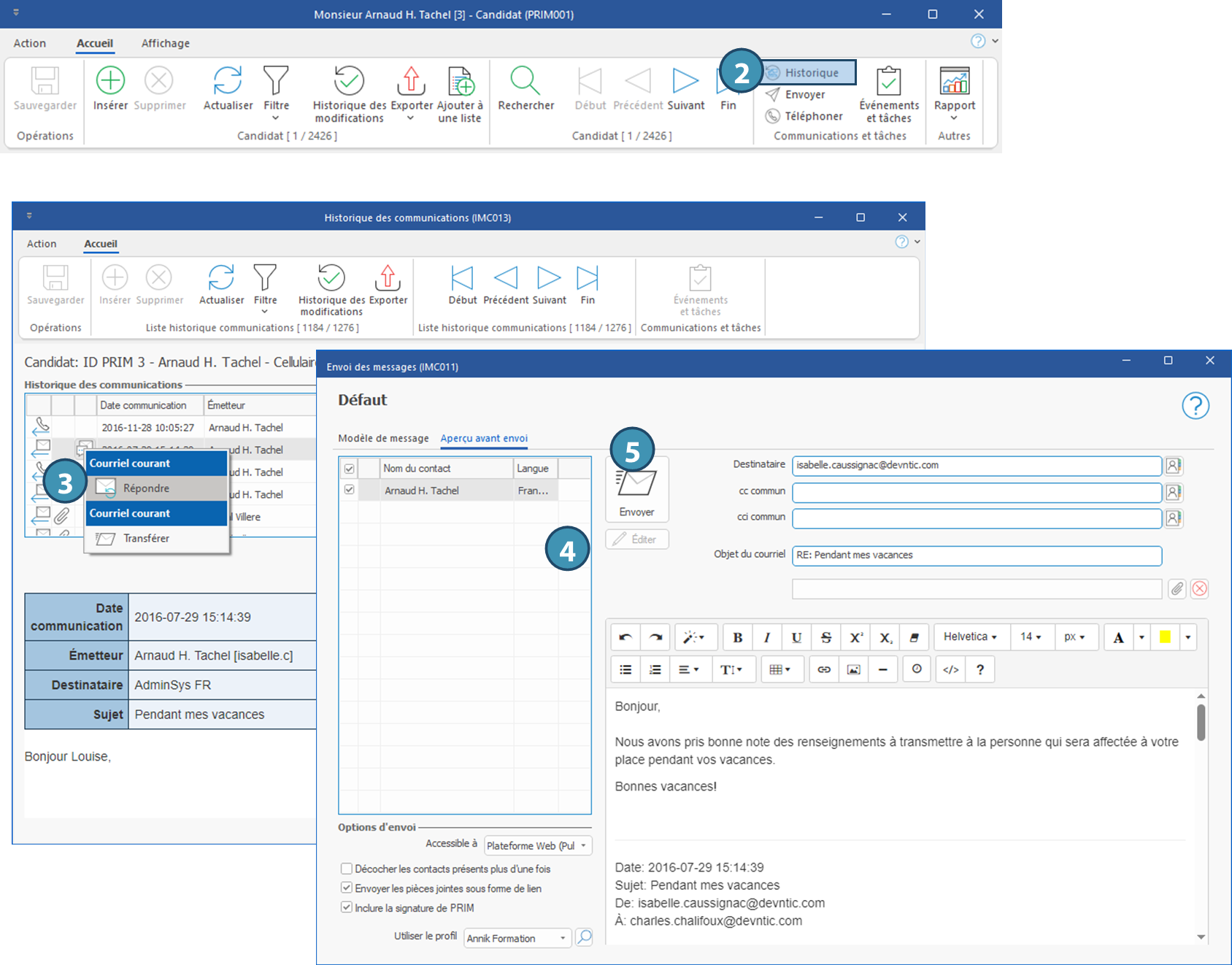 Vous pouvez envoyer des courriels à partir de toutes les fenêtres où l’icône (Envoyer un courriel ou un SMS) est disponible.
