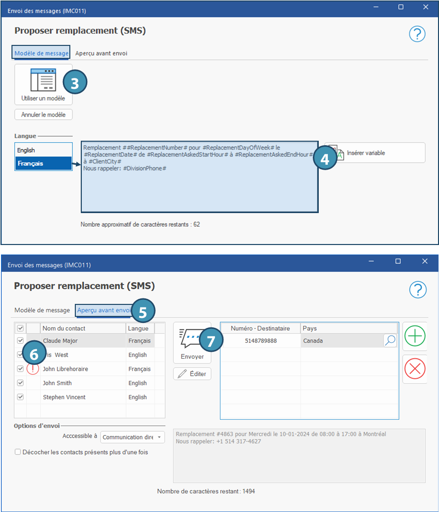 Fenêtre - Candidat : Depuis le volet « Proposition de quarts », il est possible d'envoyer un SMS avec le détail de l'horaire ou du quart proposé. Les mêmes modèles peuvent être utilisés à partir du planificateur dans la gestion des quarts, dans un quart ou dans une fenêtre de quart groupés.