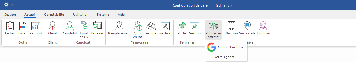 Une fois toutes ces opérations effectuées, il suffit alors de cliquer sur Publier les offres d'emploi dans le ruban Accueil de la fenêtre principale de PRIM et de sélectionner l'option appropriée.