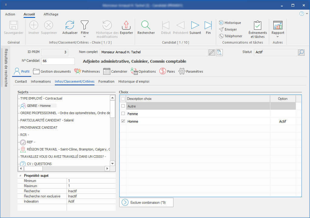 Dans la fenêtre candidat, on retrouve les critères d'indexation avec des choix à cocher pour caractériser le candidat.