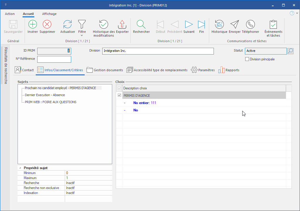 Dans la fenêtre division, on retrouve ce qui caractérise la division et des informations complémentaires à propos de celle-ci.
