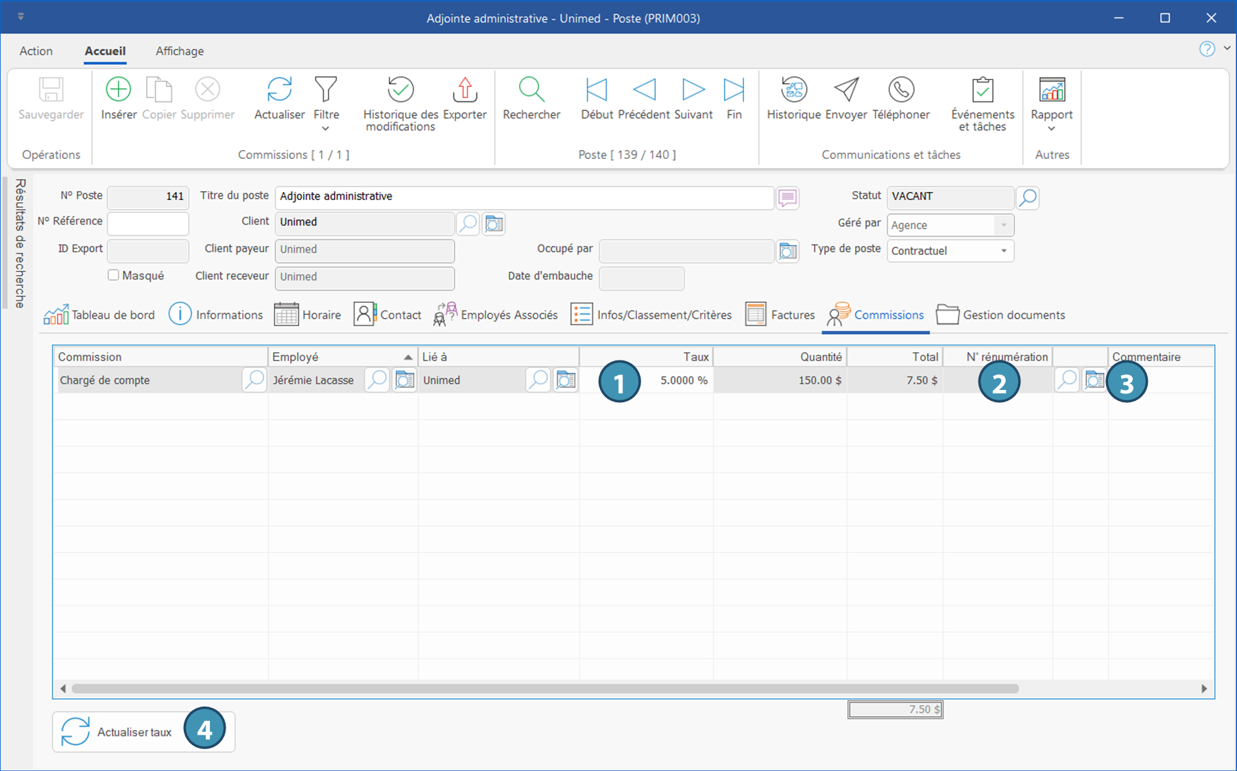 L'onglet « Commissions » permet la consultation des commissions remises ou à remettre à un employé associé au poste. Il est possible d'ajouter ou de modifier des éléments.