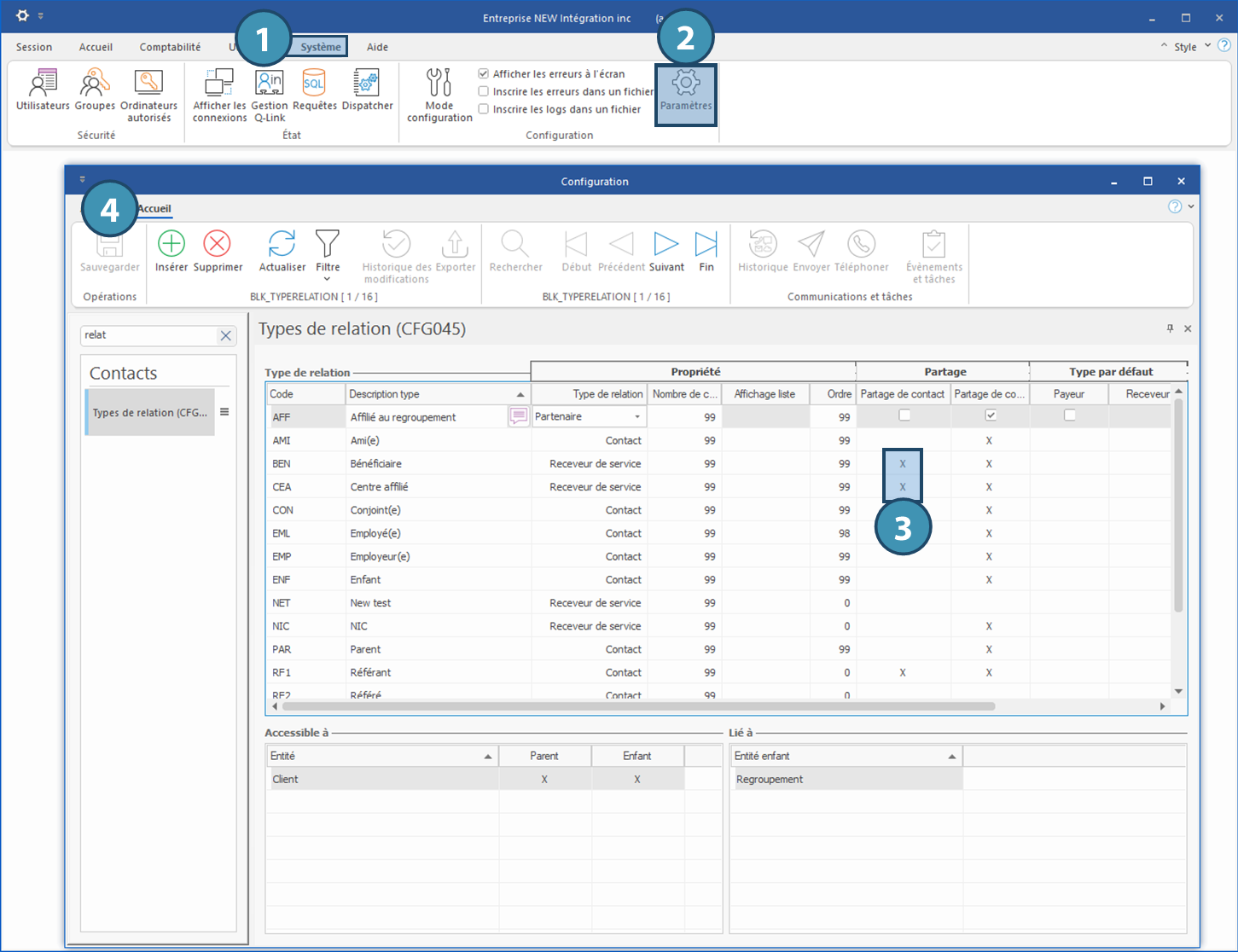 Pour être en mesure de pouvoir partager des relations, la configuration « Partage de contact » doit préalablement être cochée pour les types de relation concernés.