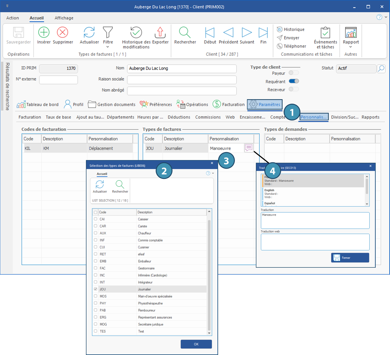 PRIM permet la personnalisation des termes ou des libellés qui s'afficheront sur les factures : vous pourrez ainsi modifier la description des codes de facturation, des types de factures ou des types de quart.
