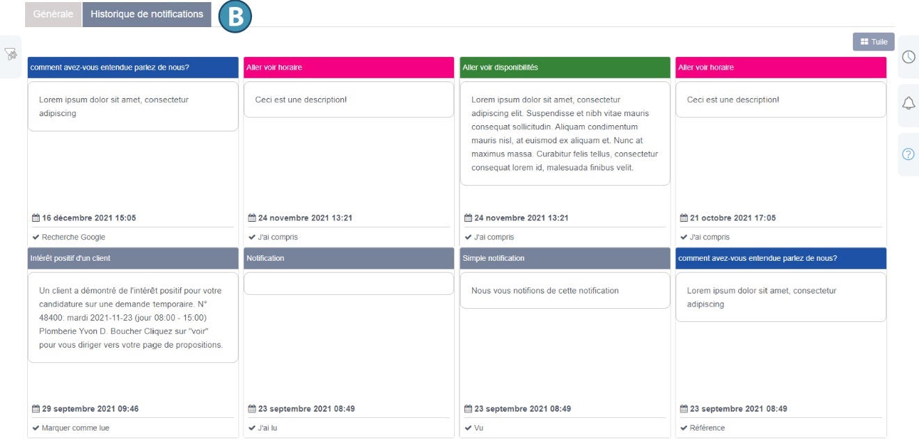 Lorsqu’une notification a été traitée, elle apparait dans l’onglet « Historique des notifications » de la section « Communications » (B)
