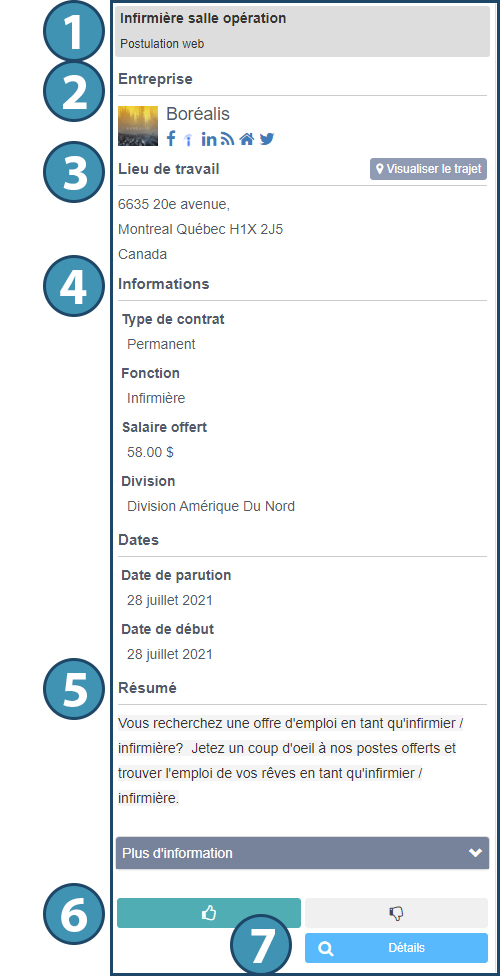 7. Un bouton « Détails » pour afficher les détails de l’offre : il s’agit de la fiche du poste, contenant la description de ce dernier.