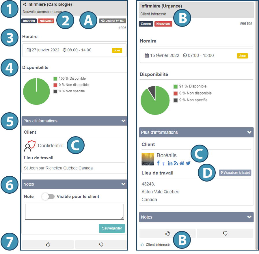 B.Si le client a déjà donné son intérêt pour cette candidature, la mention apparait dans le champ de réponse du candidat. Notez qu’en fonction du statut donné à la candidature, celui-ci peut également indiquer l’intérêt du client ;