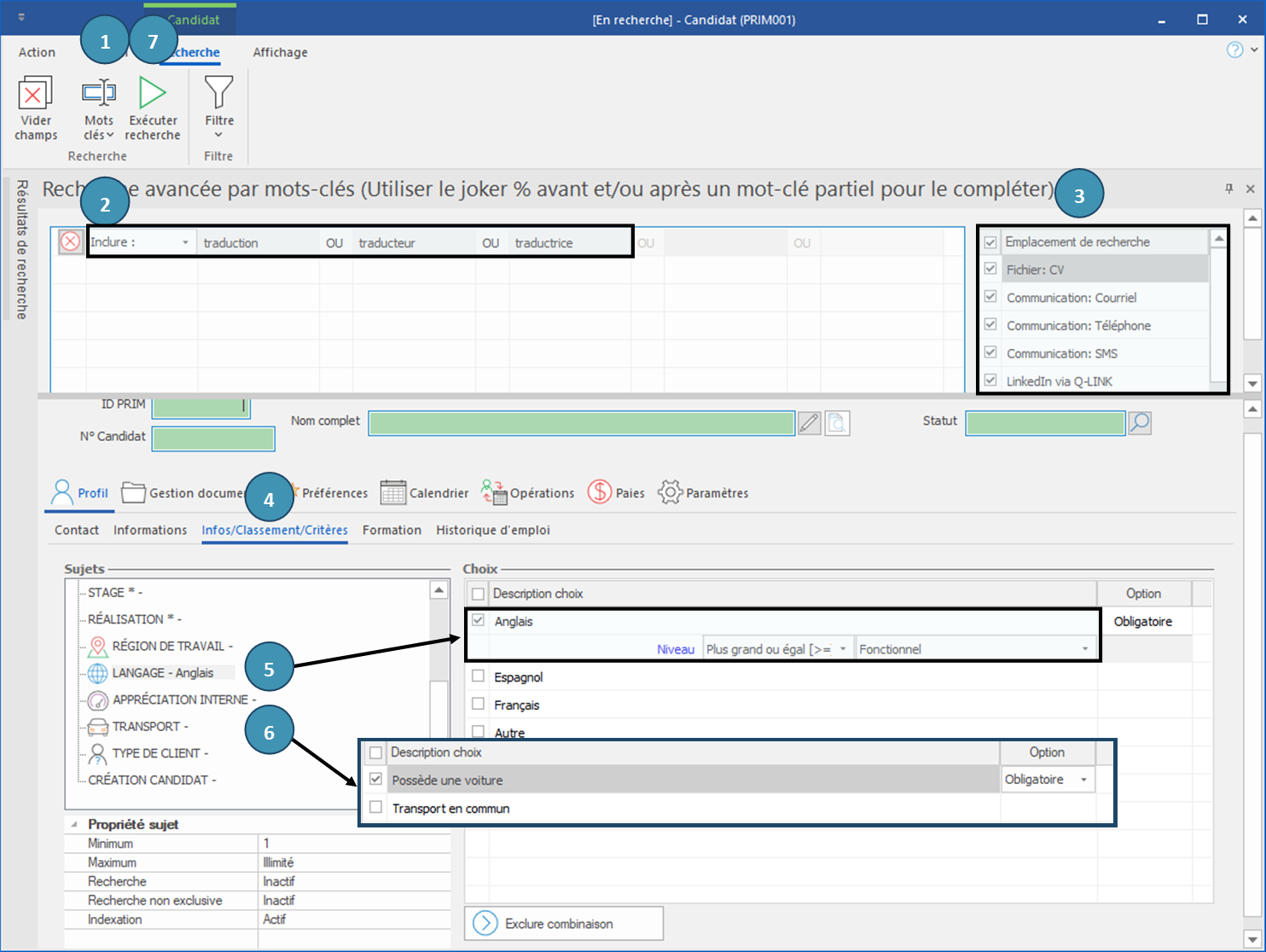 Dans l'exemple ci-dessous, on recherche un candidat avec une expérience professionnelle en comptabilité ET la maîtrise de la langue italienne.