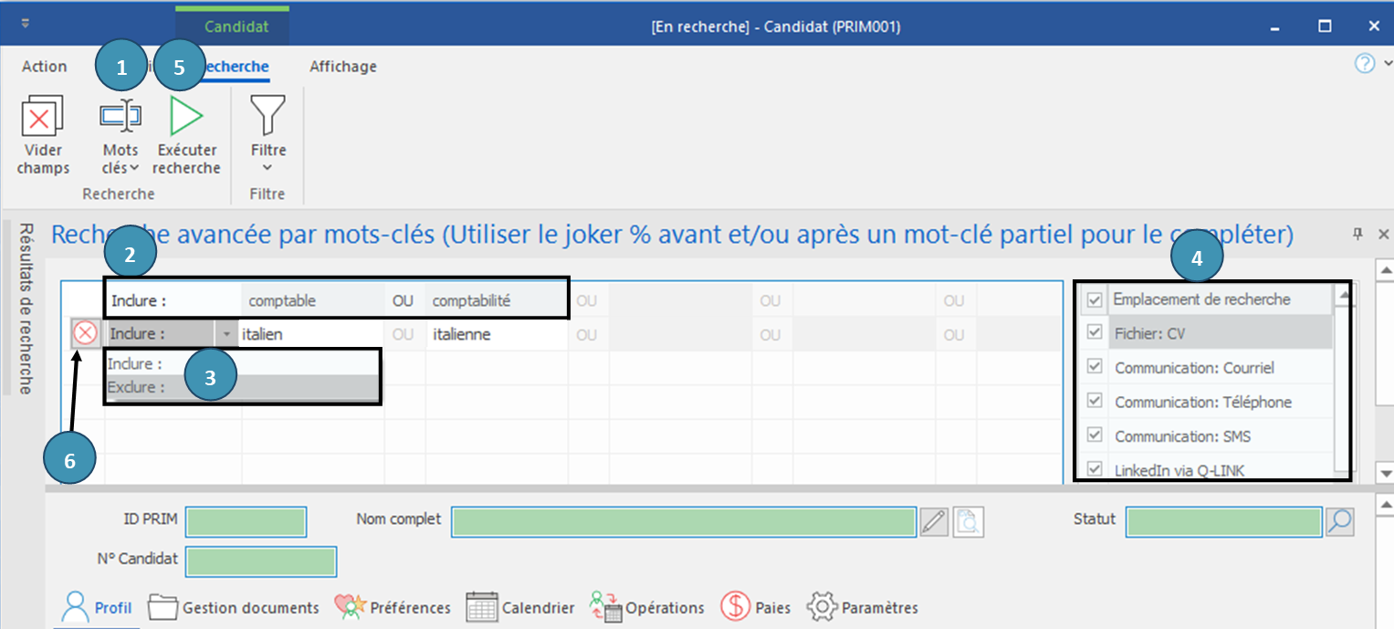 ® Vous obtiendrez les dossiers dans lesquels PRIM Logix a retrouvé le mot-clé (comptable OU comptabilité) et INCLUT le mot-clé (italien OU italienne).