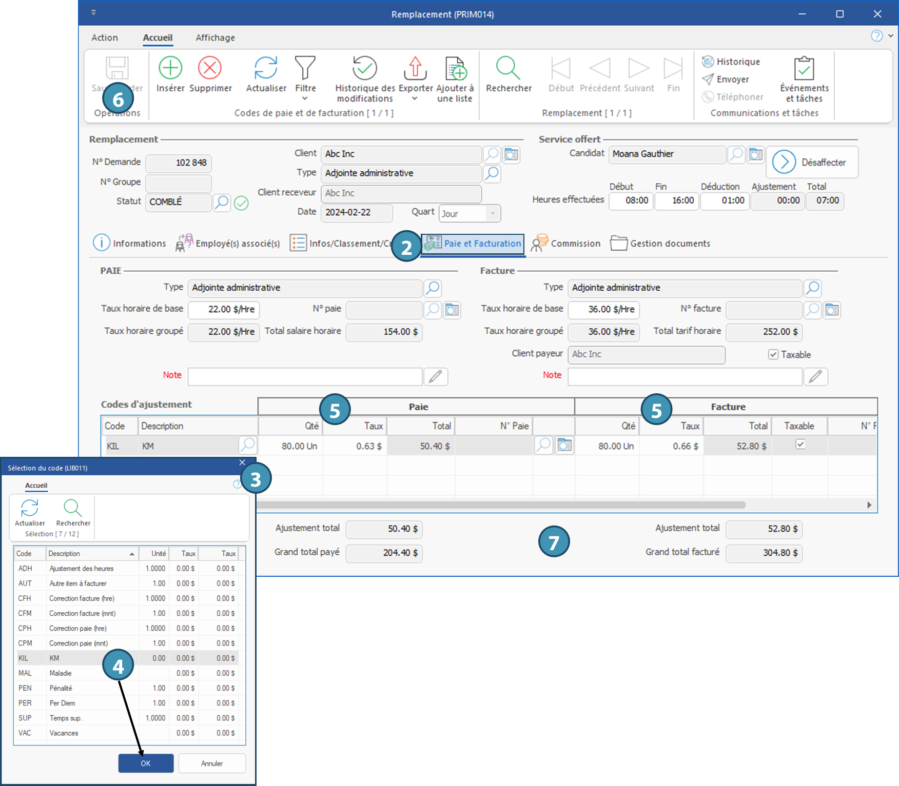 1.Ouvrez la demande dans laquelle vous désirez ajouter un code de paie ou de facturation. 2.Cliquez sur l’onglet Paie et facturation. 3.Dans la section des codes, au bas de la fenêtre, cliquez sur une ligne vide, la fenêtre Sélection du code s'affiche. 4.Sélectionnez l'élément à ajouter parmi les codes disponibles, cliquez sur OK. 5.Complétez les colonnes Qté et Taux.