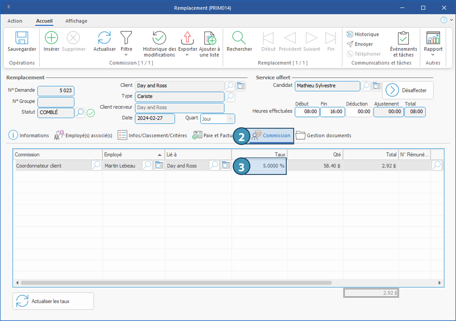 La modification d'une commission est possible depuis une fenêtre Quart, sous l'onglet Commission.