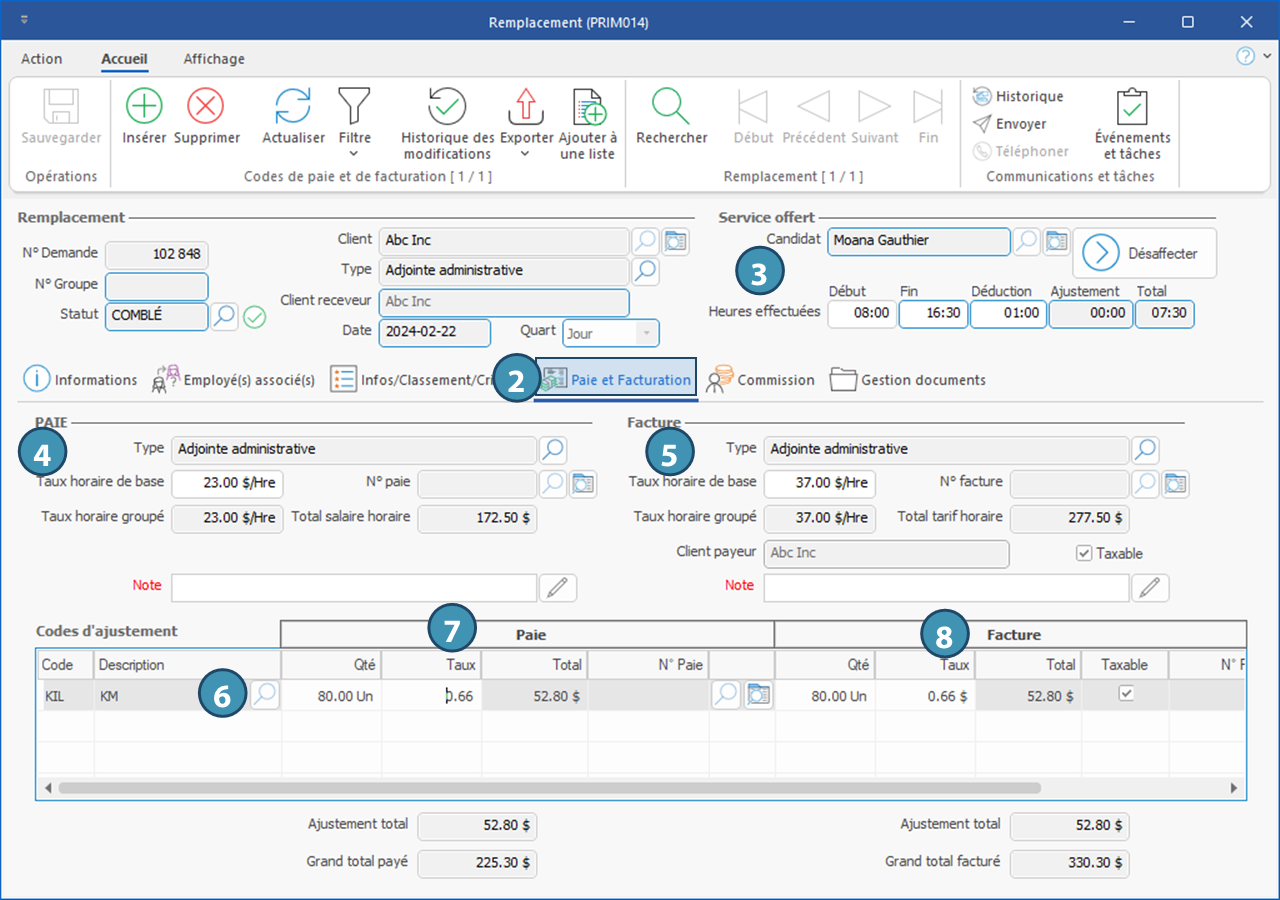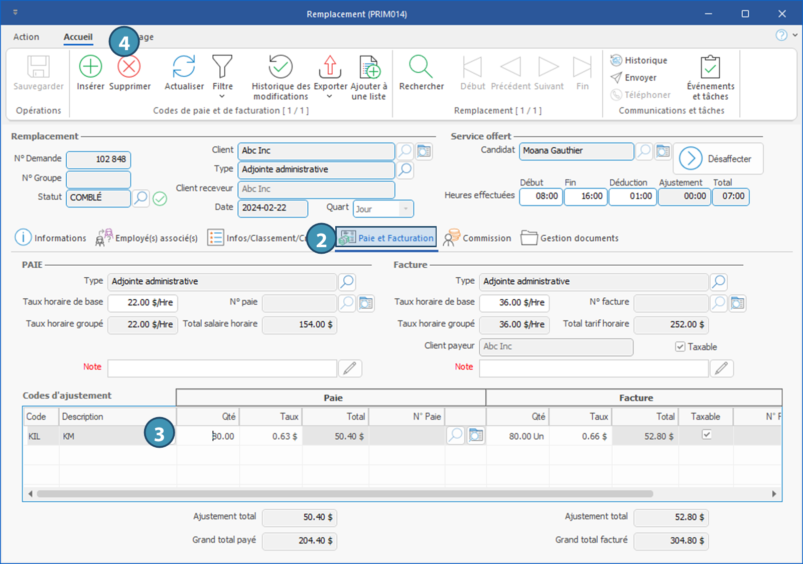 1.Ouvrez la demande dans laquelle vous désirez faire des modifications. 2.Cliquez sur l’onglet Paie et facturation. 3.Dans la section Service offert, sélectionnez le ou les champs (Début, Fin ou Déduction) à modifier et inscrivez les nouvelles valeurs. 4.Dans la section Paie, sélectionnez le montant dans le champ Taux horaire de base et inscrivez le nouveau montant. 5.Refaites la procédure pour la section Facture, s'il y a lieu. 6.Déplacez-vous dans la section des codes, sélectionnez le code à modifier. 7.Dans la colonne Taux, sélectionnez le montant dans le champ et inscrivez le nouveau montant. 8.Refaites la procédure pour la section Facture, s'il y a lieu. 9.Dans le ruban Accueil, cliquez sur