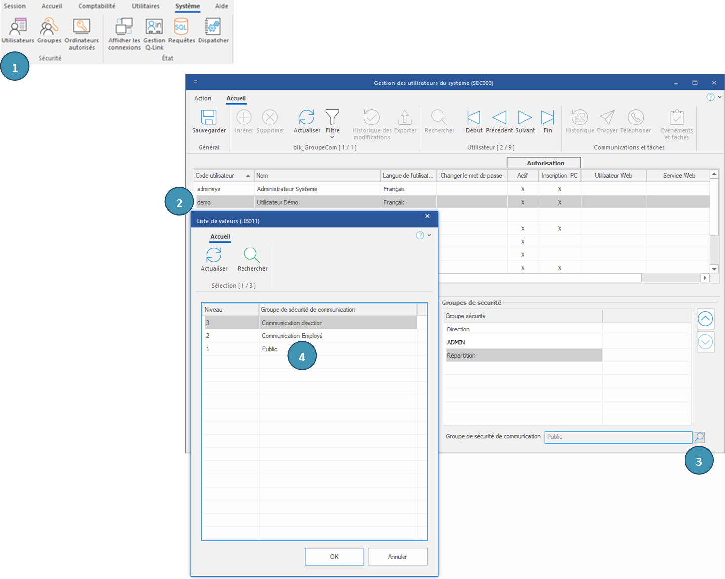 Dans la configuration de base, il existe 3 niveaux de groupe de sécurité pour la gestion des communications : Direction, Employé, Public.