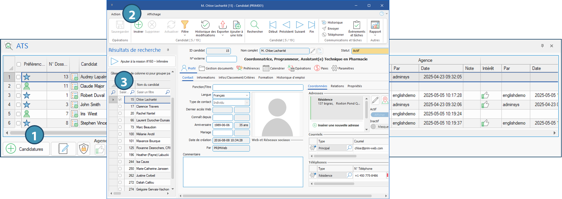 L’ATS est l’outil utilisé pour effectuer le suivi des candidatures dans un poste. Dans une fenêtre « Poste » ou « Gestion des postes », cliquez sur le bouton « ATS » dans le ruban Affichage pour l’ouvrir.